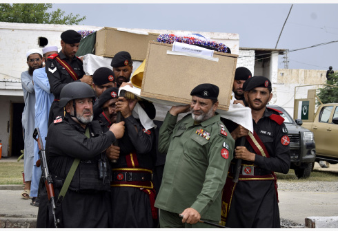 (230523) -- BANNU, May 23, 2023 (Xinhua) -- Security personnel attend funeral ceremony of their colleagues who were killed in an attack on a private oil and gas exploitation plant, in northwest Pakistan's Bannu on May 23, 2023. At least six security members were killed when a group of terrorists stormed a private oil and gas exploitation plant in Pakistan's northwestern Khyber Pakhtunkhwa province, police officers said on Tuesday. (Str/Xinhua)