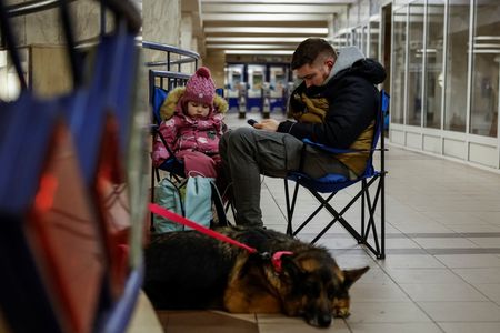 A man with a child and a dog takes shelter inside a metro station during a Russian military strike, amid Russia's attack on Ukraine, in Kyiv, Ukraine April 6, 2025. REUTERS/Alina Smutko
