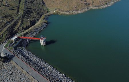 A drone view of El Carrizo dam, after the U.S. announced it will deny for the first time a request by Mexico to send water through a special delivery channel from the Colorado River to Tijuana, due to shortfalls in Mexico's water deliveries under the water sharing treaty signed in 1944 by both nations, in Tecate, Mexico, March 21, 2025. REUTERS/Jorge Duenes