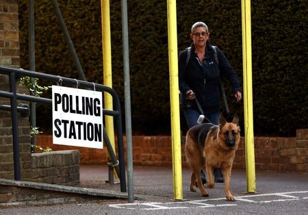 A woman and her dog leave a polling station in Rickmansworth, Britain, May 1, 2025. REUTERS/Suzanne Plunkett