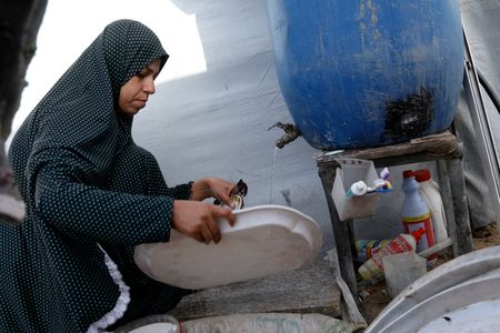FILE PHOTO: A Palestinian woman washes the dishes inside her tent, in Khan Younis, in the southern Gaza Strip, May 1, 2025. REUTERS/Hatem Khaled/File Photo