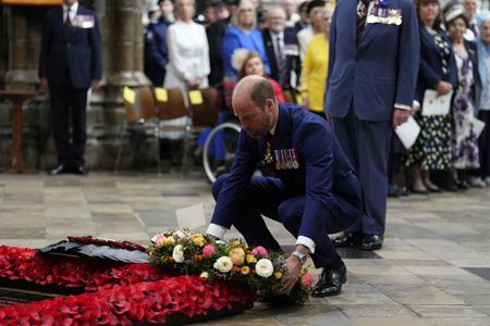 The Prince of Wales lays a wreath at the grave of the Unknown Warrior during a service of thanksgiving at Westminster Abbey in London on the 80th anniversary of VE Day. Picture date: Thursday May 8, 2025. Jordan Pettitt/Pool via REUTERS