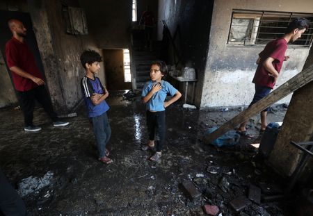 Palestinian children stand at the site of an Israeli strike on a school sheltering displaced people, in Gaza City, July 25, 2025. REUTERS/Mahmoud Issa/File Photo