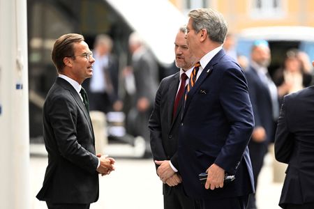 Sweden's Prime Minister Ulf Kristersson greets U.S. Treasury Secretary Scott Bessent and U.S. trade representative Jamieson Greer outside Rosenbad ahead of trade talks between the U.S. and China in Stockholm, Sweden July 28, 2025. TT News Agency/Fredrik Sandberg via REUTERS