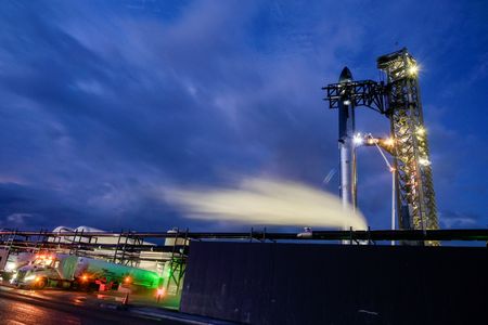 Fuel trucks carrying liquid nitrogen line up before sunrise as preparations to launch a SpaceX Starship spacecraft continue, at the company's complex, in Starbase, Texas, U.S., August 25, 2025. REUTERS/Steve Nesius