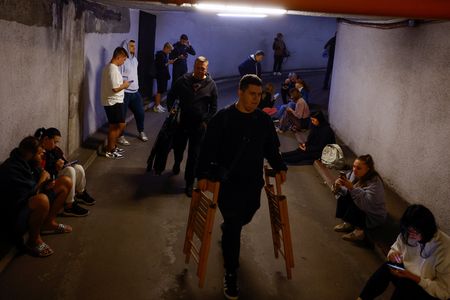 People take shelter inside an underground parking during Russian drone and missile strikes, amid Russia's attack on Ukraine, in Kyiv, Ukraine August 28, 2025. REUTERS/Valentyn Ogirenko