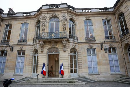 A microphone is set up in the courtyard before a statement by French outgoing Prime Minister Sebastien Lecornu at the Hotel Matignon in Paris after launching a series of talks with political parties' leaders as France faces a political crisis following the announcement of the resignation of the new government, France, October 8, 2025. REUTERS/Stephanie Lecocq