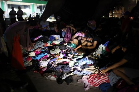 People search through clothes donated by locals along a street, after a river overflowed following torrential rains, in Alamo, Mexico, October 16, 2025. REUTERS/Henry Romero