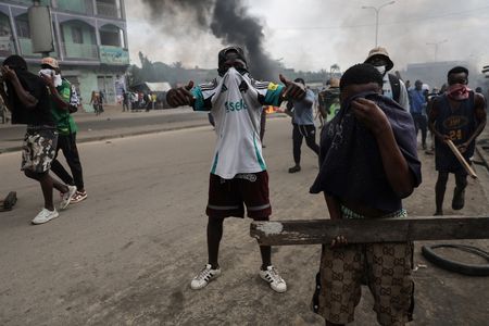 Supporters of the Cameroon opposition candidate Issa Tchiroma cover their faces as they clash with security forces after the Constitutional Council declared President Paul Biya the winner of the October 12 presidential election in Douala, Cameroon, October 27, 2025. REUTERS/Zohra Bensemra Bensemra