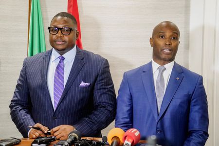Sierra Leone's Foreign Minister Timothy Musa Kabba and Guinea-Bissau’s Foreign Minister Joao Bernardo Vieira speak to the media after a meeting between a delegation from the Economic Community of West African States (ECOWAS) regional bloc and Guinea-Bissau's military leaders, in Bissau, December 1, 2025. REUTERS/Delcyo Sanca