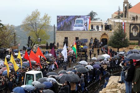 People watch Pope Leo XIV arriving to visit the tomb of Saint Charbel Makhlouf at the Monastery of Saint Maron, during his first apostolic journey, in Annaya, Lebanon December 1, 2025. REUTERS/Mohamed Azakir