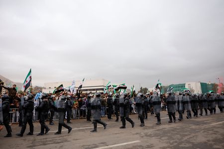 Syrian police walk while people gather as they celebrate the first anniversary of Bashar al-Assad's fall, at Ummayad Square in Damascus, Syria December 8, 2025. REUTERS/Yamam al Shaar
