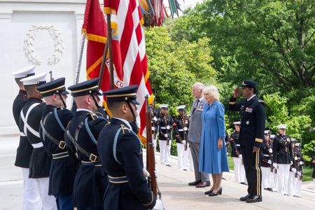 Before heading to a street party in the small Virginia town of Front Royal, Charles crossed the Potomac River to pause at Arlington National Cemetery, a venerated site where tens of thousands of the country's war dead are buried. He was greeted by a 21-gun salute before laying a wreath at the Tomb of the Unknown Soldier. On Wednesday the king and queen commemorated victims of al Qaeda's attack on New York City on September 11, 2001, placing flowers and a hand-written note at the memorial where the World Trade Center's twin towers once stood.