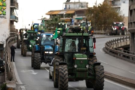 ATHENS, Feb 13 (Reuters) - Greek farmers drove dozens of tractors into central Athens on Friday to protest over rising production costs and tough competition from abroad, saying that what the government had offered them so far was not enough to stay afloat.