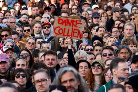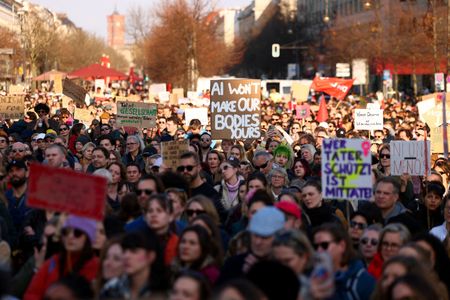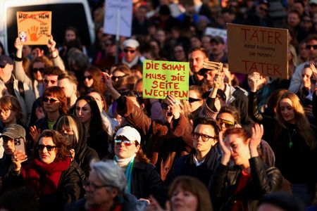 More than ⁠10,000 people gathered at Berlin's Brandenburg Gate on Sunday to call for an end to violence against women and support ⁠Fernandes, holding signs such as "Thanks Collien" and "AI won't make our bodies yours".