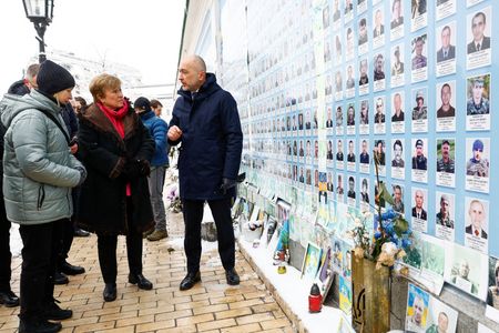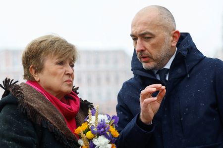 Ukraine's top central banker, Andriy Pyshnyi, greeted Georgieva at her first stop, St. Michael's Golden-Domed Monastery in a square in central Kyiv. They placed flowers at a memorial wall bearing portraits of thousands of Ukrainian soldiers killed since 2014 while fighting Russia.