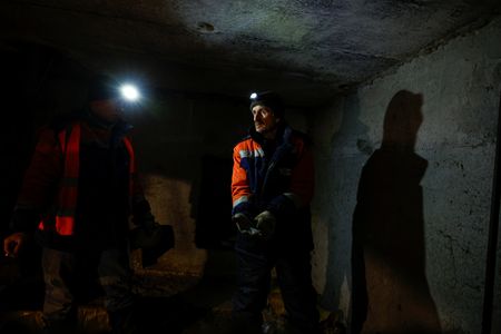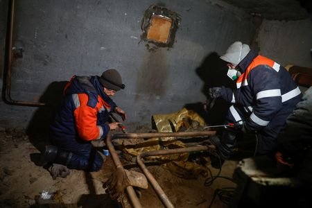 During a recent visit by Reuters, he was snaking through the darkness of a damp cellar scattered with debris and dust from broken insulation. Clanking metal echoed. Another bundled worker held a hissing flame to a pipe.