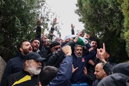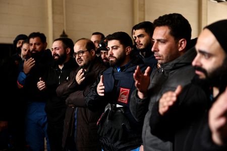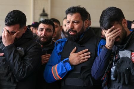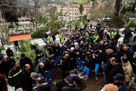 NABATIEH, Lebanon, March 25 (Reuters) - Wearing identical uniforms, a dozen paramedics gathered around a pair of caskets in the southern Lebanese town of Nabatieh, crying so heavily their shoulders shook, as they prepared to bury two of their own killed in an Israeli strike.