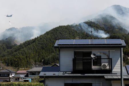 OTSUCHI, Japan, April 26 (Reuters) - Japan has deployed 1,400 firefighters and 100 Self-Defense Force personnel to battle mountain blazes in the northern part of the country, with the fires, now burning on Sunday for a fifth straight day, continuing to threaten a picturesque coastal town.