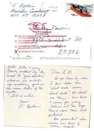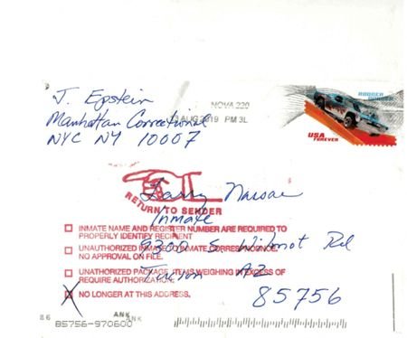 The agency said the FBI concluded that the writing does not appear to match Epstein's and that it was postmarked three days after Epstein's death out of Northern Virginia. Epstein at the time of his death was incarcerated in a New York jail. It also did not include his inmate number as required for outgoing mail.