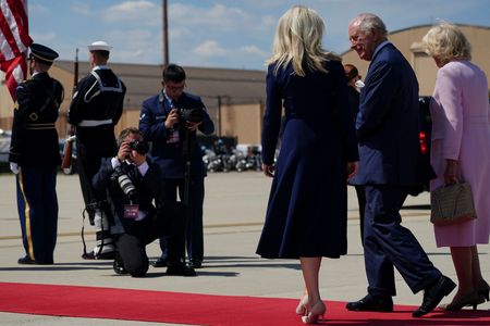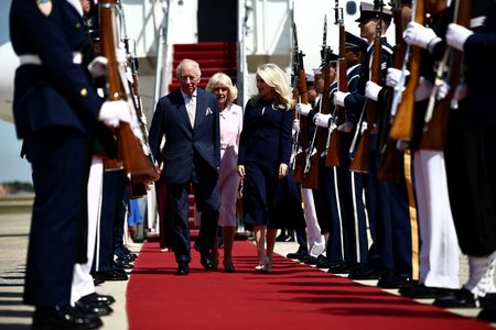 Charles and Camilla touched down at Joint Base Andrews around 2:30 p.m. ET (1830 GMT), where they were greeted by diplomatic, state and federal officials as well as senior members of the British embassy and accepted flowers from the children of British military families stationed in the U.S.