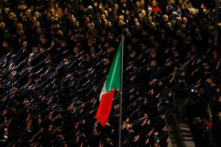 The Via Acca Larentia commemoration has traditionally been marked by hundreds of men making the stiff-armed Roman salute and shouting "present" -- a rallying cry of neofascists.
