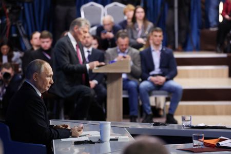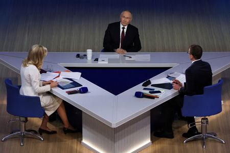 Putin was addressing an annual press conference and "Direct Line" phone-in that ran for almost 4-1/2 hours. While Ukraine was the dominant topic, the event was punctuated by bizarre moments and occasional barbed comments from ordinary Russians whose text messages were flashed up on a big screen in the hall.