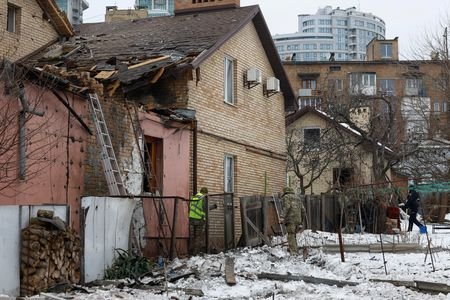Authorities in the capital city of Kyiv reported that several buildings in three districts of the city were damaged by falling debris from downed missiles and drones.