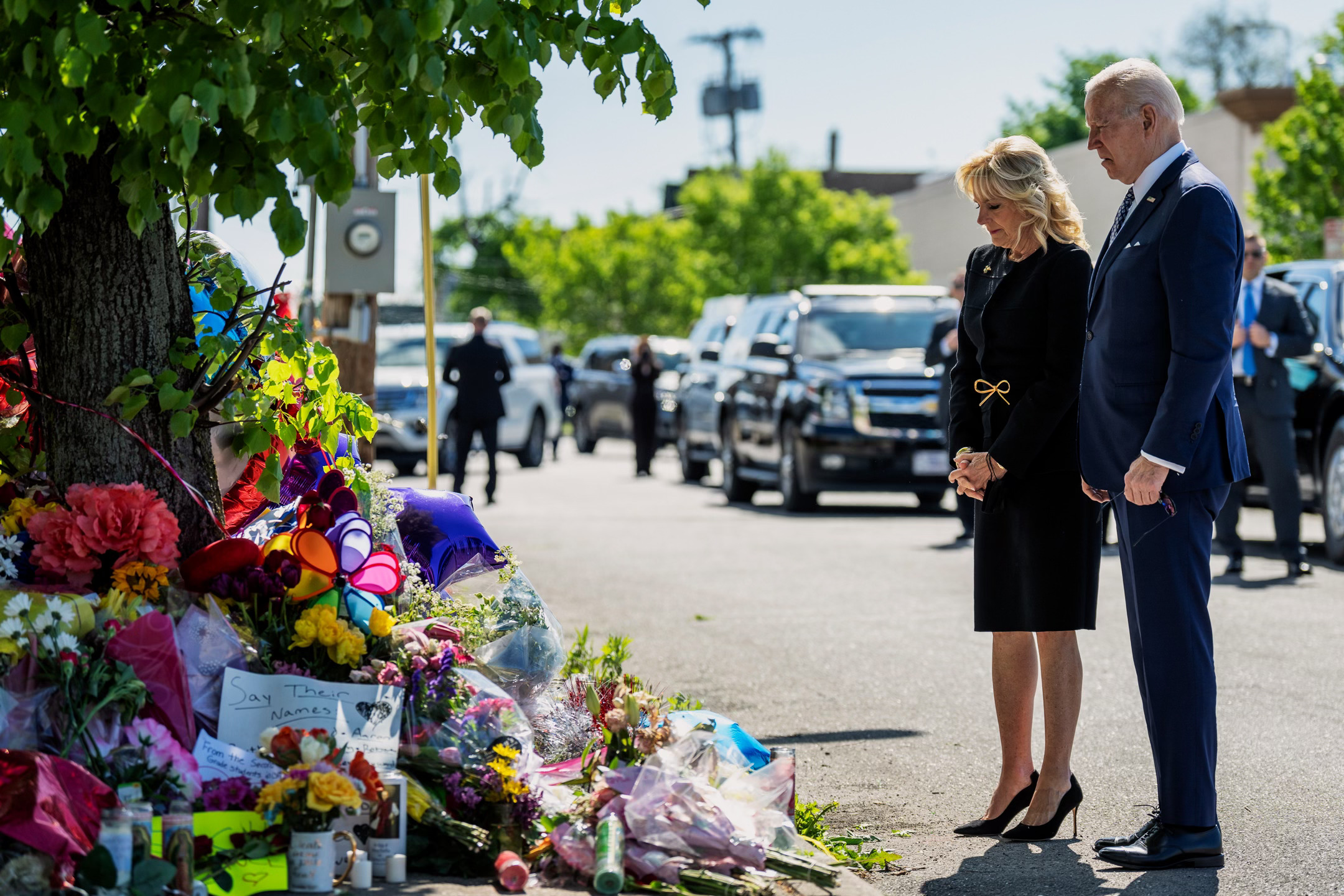 President Joe Biden and First Lady Jill Biden pay their respects at a memorial to the victims of the 14 May shooting at Tops Supermarket, Tuesday 17 May 2022, in Buffalo, New York. (⇲ Public Domain) Photograph Adam Schultz, May 2022.