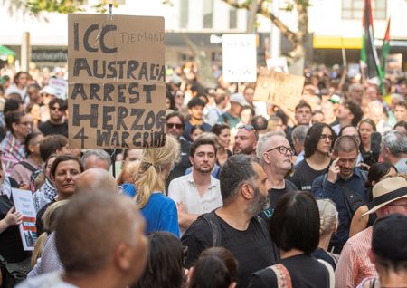 SYDNEY, Feb ​9 (Reuters) - Thousands gathered across Australia on Monday to protest over the arrival of Israeli President Isaac Herzog, who is on a multi-city trip aimed at expressing solidarity with Australia's Jewish community following a deadly mass shooting last year.